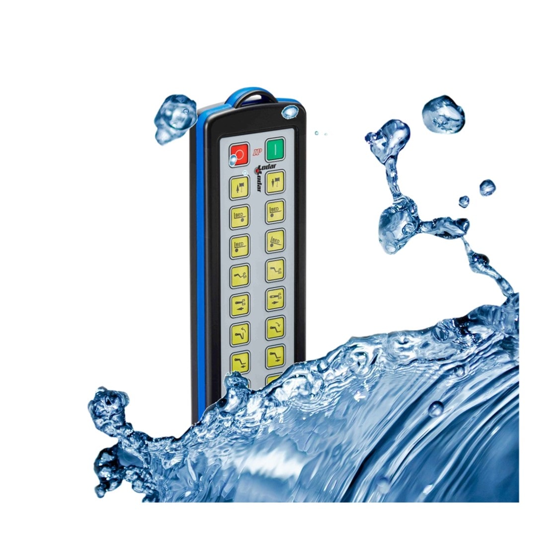 Die Serie 9000 IP ist eine Funkfernsteuerung für den industriellen Einsatz. Sie ist in mehreren Versionen – von 2 bis 40 Funktionen – erhältlich und kann darüber hinaus mit unzähligen zur Verfügung stehenden oder Ihren kundenspezifischen Labels auf die jeweilige Applikation angepasst werden. Diese vielseitige Fernsteuerung zeichnet sich durch ihre Robustheit und Zuverlässigkeit aus. Es kann eine Reichweite von ca. 50 m bis maximal 250 m gewählt werden. Des Weiteren besteht auch die Möglichkeit, mehrere Sender an einem Empfänger anzumelden und/oder z. B. für Toranwendungen jeder Sendertaste einen einzelnen Empfänger zuzuordnen. Die Schutzklasse liegt bei IP 65, sodass dieser Sender staubdicht und vor Strahlwasser geschützt ist.